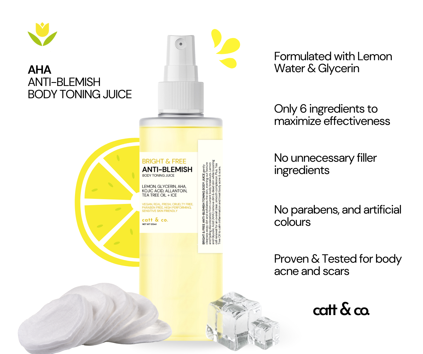 BRIGHT & FREE ANTI-BLEMISH BODY TONING JUICE cleanses away dirt and gently exfoliates the skin, evening out texture and fading discoloration from current body breakouts. Lemon and Glycolic Acid (AHA) remove dirt & dead skin while boosting cell renewal for an overall clear, smooth complexion. Plus, Tea Tree Oil to calm inflammation and treat body acne & scars.