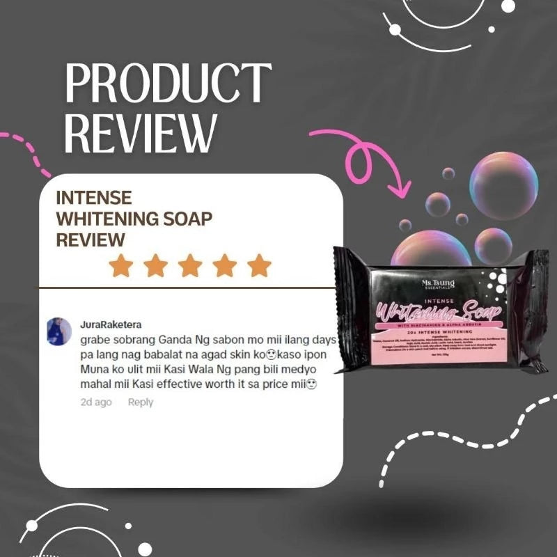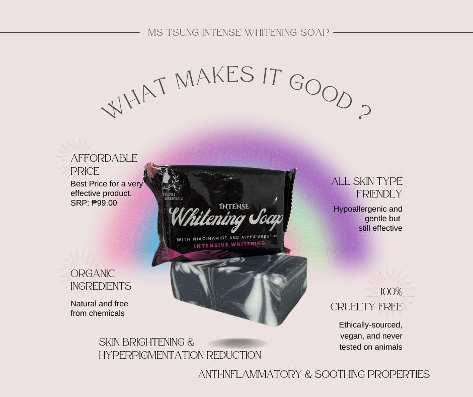 - Experience the magic of Ms Tsung Essentials Intense Whitening Soap! Infused with powerful Niacinamide and Alpha Arbutin, this soap is your go-to solution for reducing dark spots and hyperpigmentation. Say hello to radiant, even-toned skin! 🌟