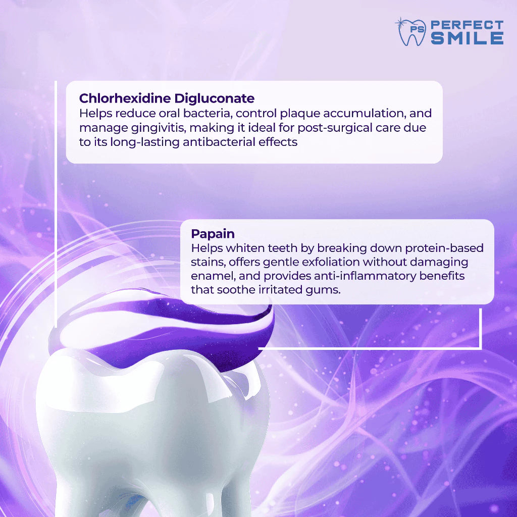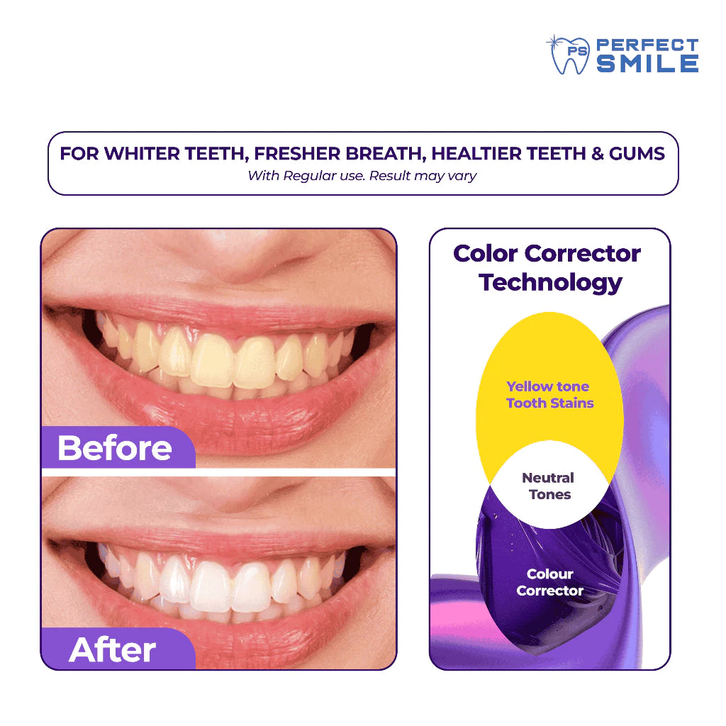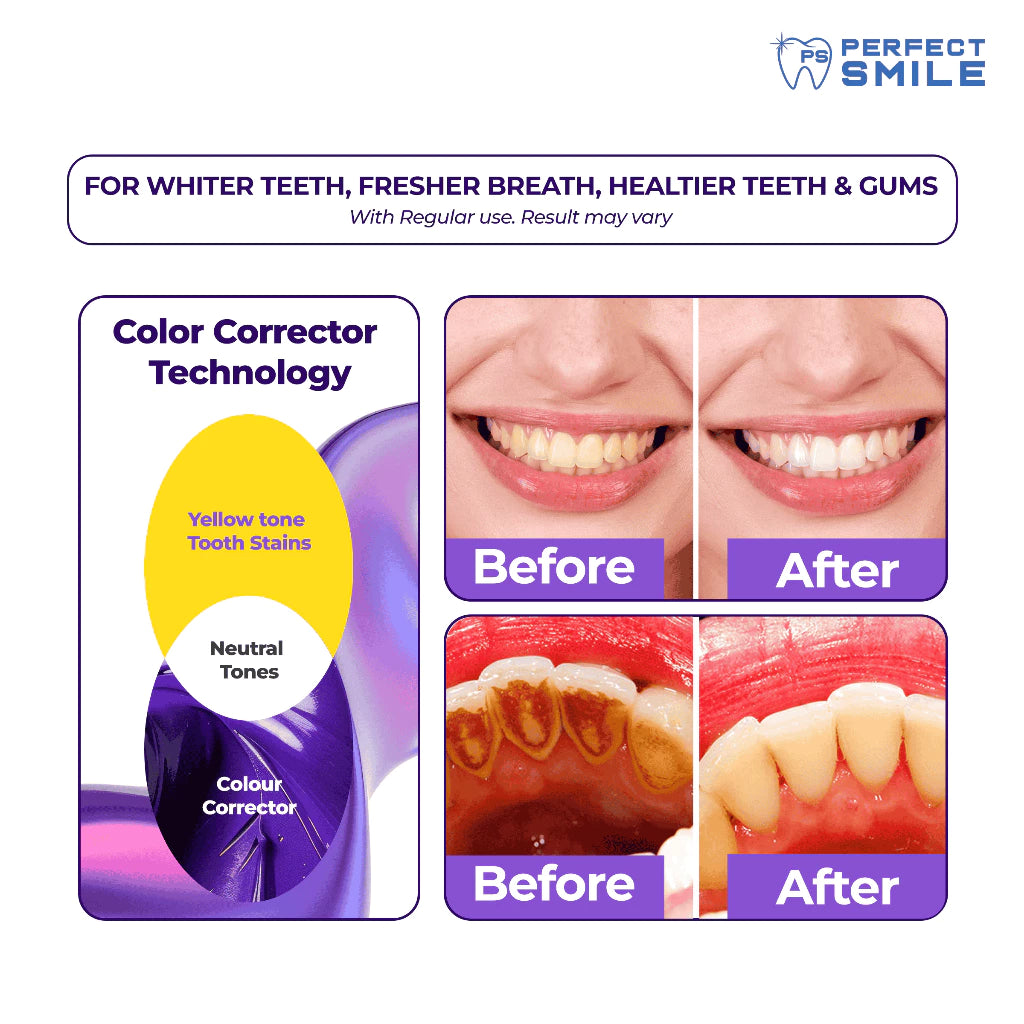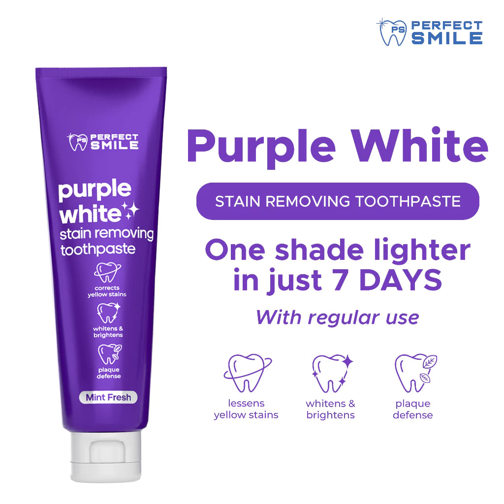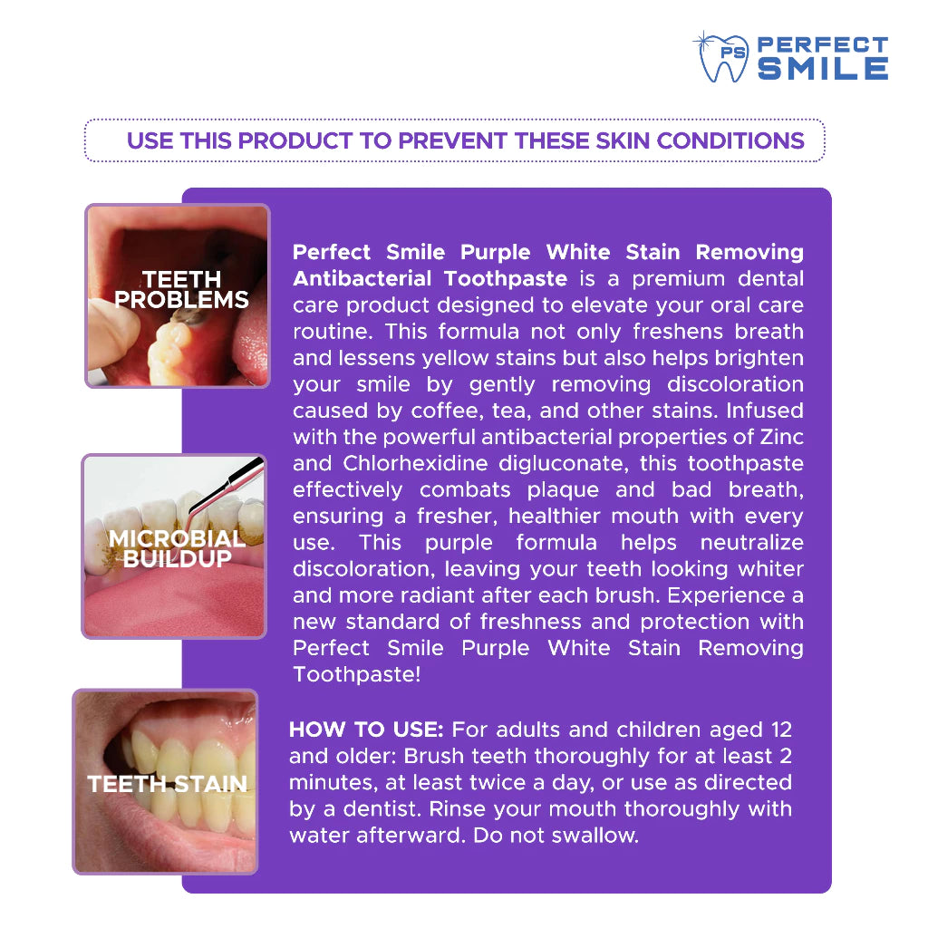 Perfect Smile Purple White Stain Removing Antibacterial Toothpaste is a premium dental care product designed to elevate your oral care routine. This formula not only freshens breath and lessens yellow stains but also helps brighten your smile by gently removing discoloration caused by coffee, tea, and other stains. Infused with the powerful antibacterial properties of Zinc and Chlorhexidine digluconate, this toothpaste effectively combats plaque and bad breath, ensuring a fresher, healthier mouth with every use. This purple formula helps neutralize discoloration, leaving your teeth looking whiter and more radiant after each brush. Experience a new standard of freshness and protection with Perfect Smile Purple White Stain Removing Toothpaste!