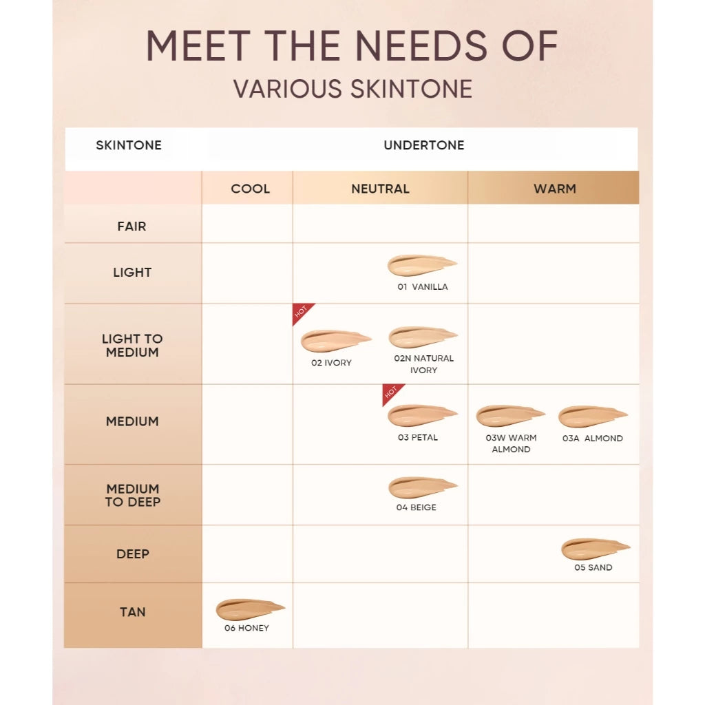 Cover All Perfect Cushion perfecting your complexion in one tap, with Nano Silicone Crosspolymer 0.25 micron, give you lightweight texture with high coverage (medium to full coverage) flawless finish look. Raincoat Protective Film Technology will shield your look against oil and water, making your look last for 12 hours. Enriched with blend of 5X Ceramide, Centella and Hyaluronic Acid that will nourish and strengthen your skin barrier. Completed with SPF 35 PA++++ physicochemical sunscreen help to protect your skin against UV damage. Included with teardrop-shape puff made with Rubycell Puff Technology breath out the cushion application while smooth out it’s finish. Available in 5 shades: Vanilla, Ivory, Petal, Beige, and Sand fashioned in travel-friendly compact double mirrored packaging.